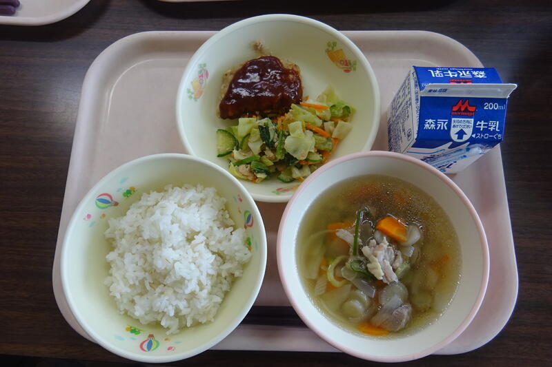 本日の献立:麦ごはん・鶏ごぼうスープ・手作りハンバーク・野菜とツナのサラダ・牛乳