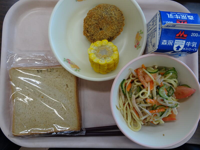 本日の献立:黒糖パン・冷やし中華・メンチカツ・とうもろこし・牛乳