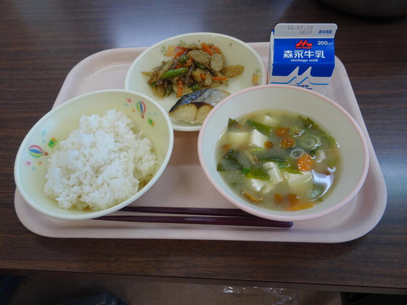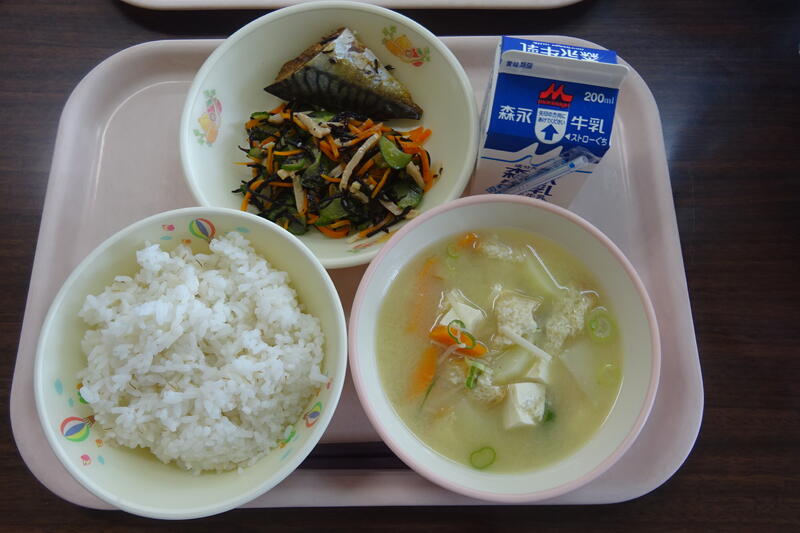 本日の献立:麦ごはん・みそ汁・さばのソース煮・ひじきのサラダ・牛乳