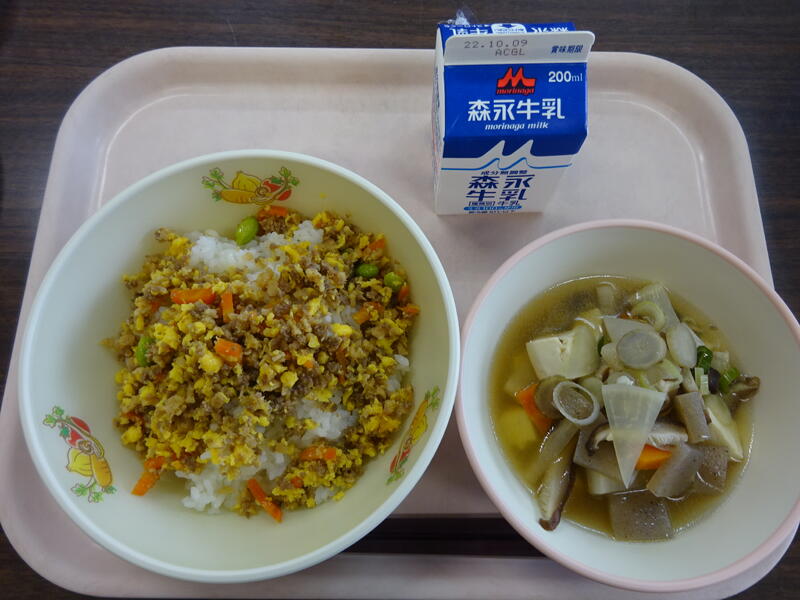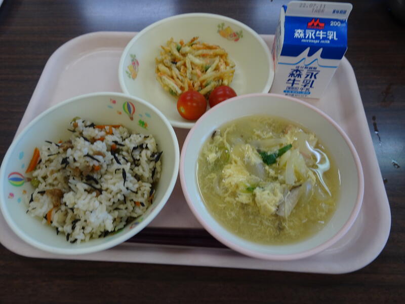 本日の献立:ひじきごはん・かぼちゃとにらのみそ汁・千草焼・牛乳
