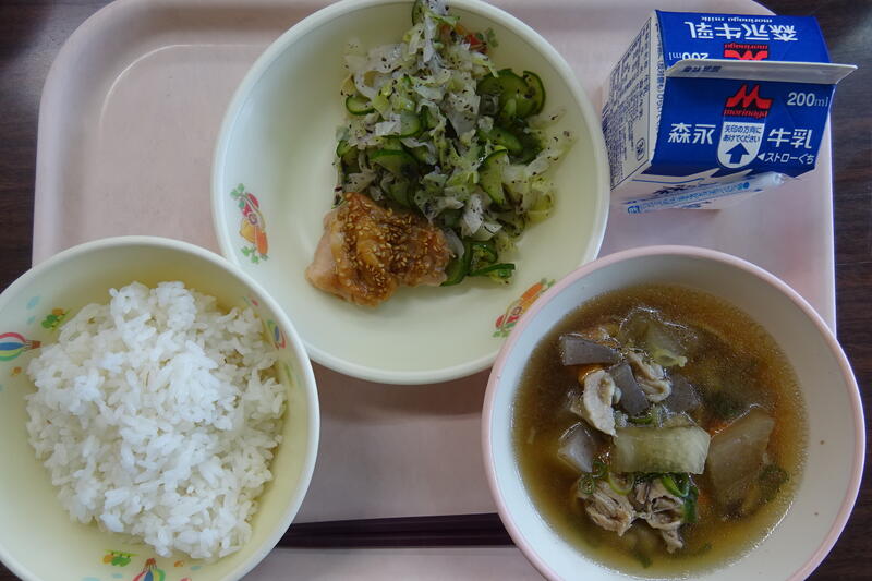 本日の献立:麦ごはん・夏のっぺい汁・鶏のピリ辛焼き・きゅうりのゆかり和え・牛乳