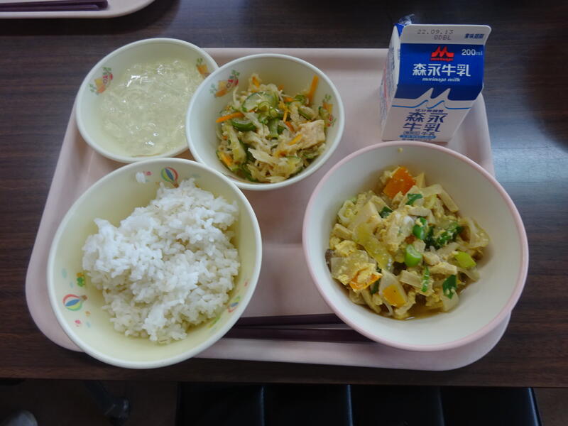献立:麦ごはん・高野豆腐の卵とじ・切干大根の酢の物・梅ゼリー・牛乳
