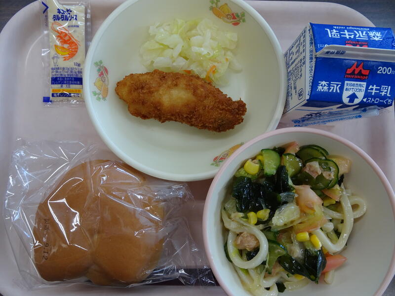 本日の献立:セルフフィッシュバ-ガ-(丸パン)・サラダうどん・ホキフライ・タルタルソース・牛乳