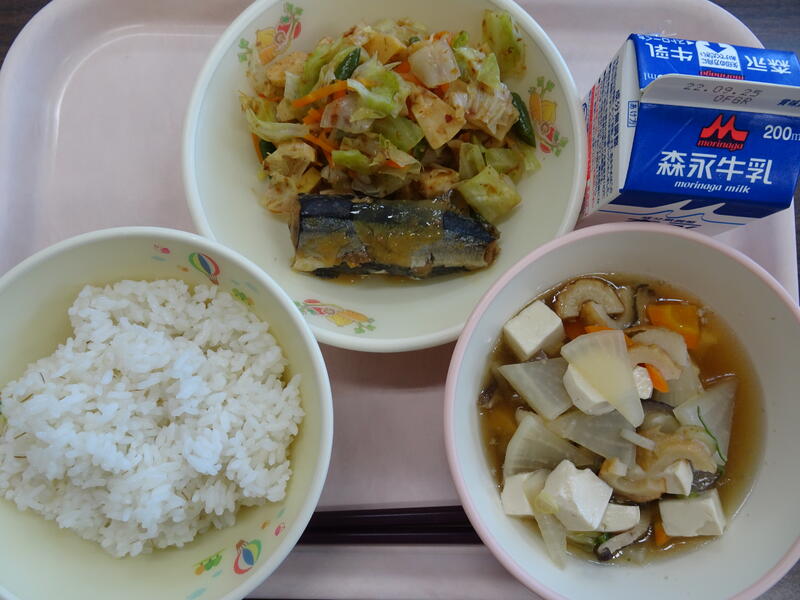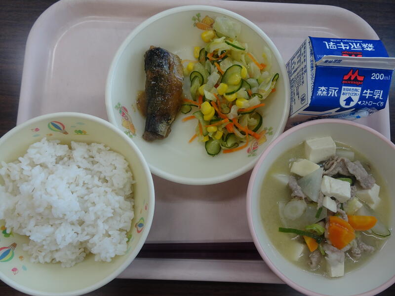 本日の献立:麦ごはん・つぼん汁・さんまゆずみそ煮・たけのこのおかかあえ・牛乳