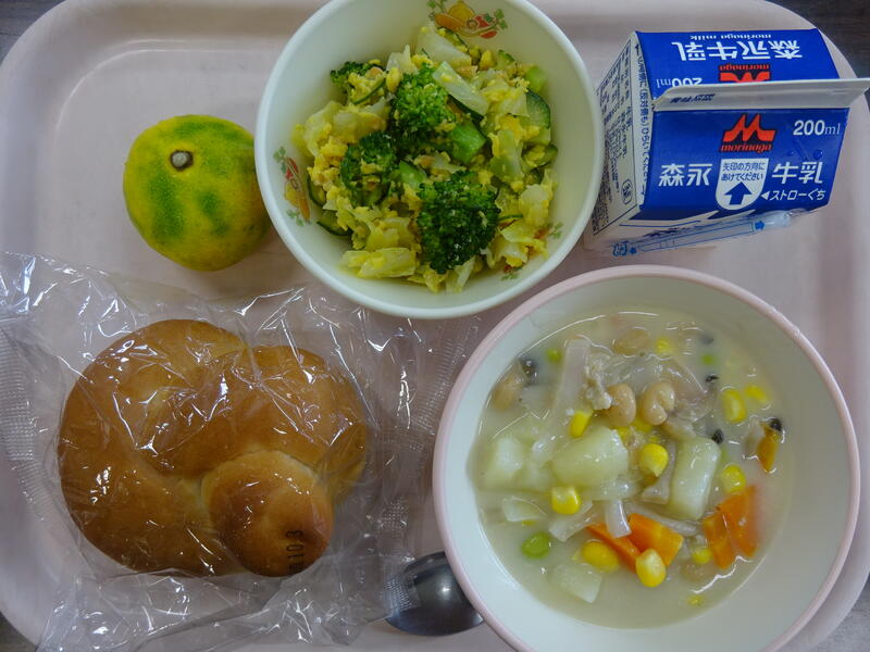 本日の献立:ひのくにパン・白いんげん豆のシチュー・グリーンエッグサラダ・みかん・牛乳