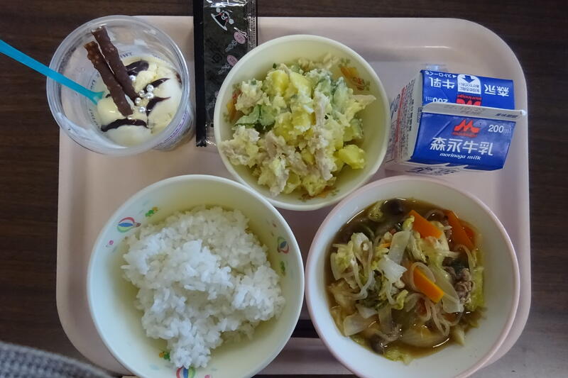 本日の献立:麦ごはん・すき焼き風煮・ダブルポテトサラダ・味付けのり・パフェ・牛乳