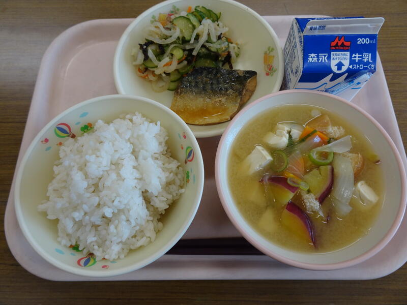 本日の献立:麦ごはん・さつまいものみそ汁・さばの煮つけ・四色なます・牛乳