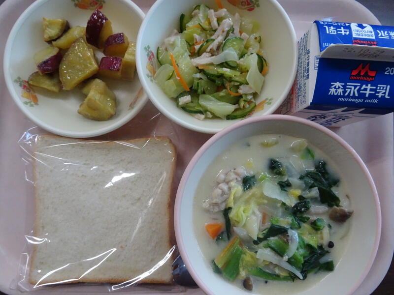 本日の献立:食パン・白菜のクリーム煮・キャベツのマスタードサラダ・キャラメルポテト・牛乳