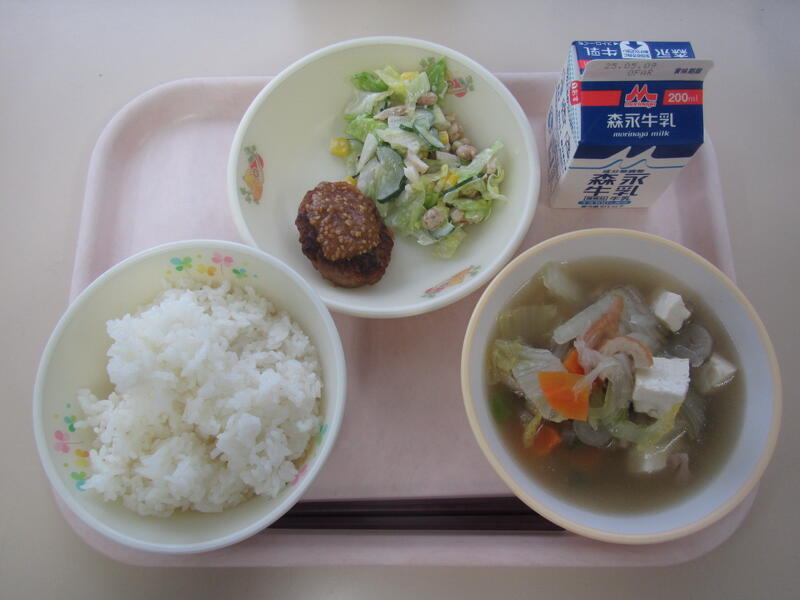本日のお品書き:有機米ごはん・鶏 ごぼうスープ・ハンバーグのごまみそだれ・カリカリ豆 サラダ・牛乳