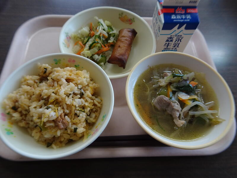 今日のメニュー :キムチご飯、中華スープ、春巻き、ゆかりあえ、牛乳