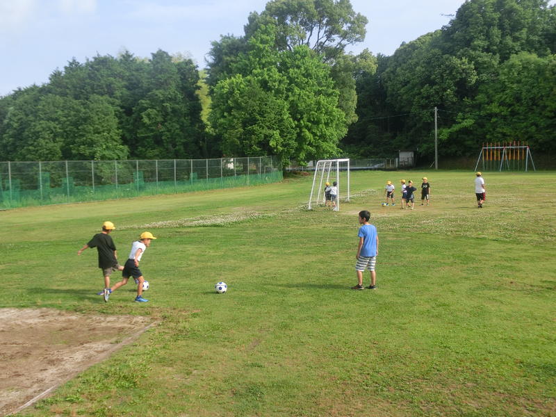 朝からサッカー(コーナーキックの練習?)。補修したフェンスにボール当ててほしいな(^^)/