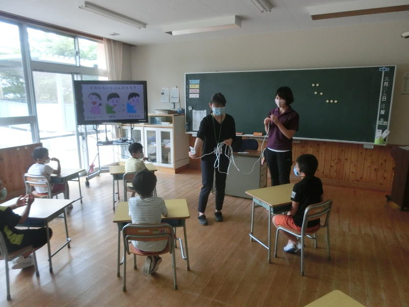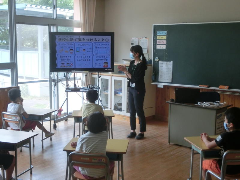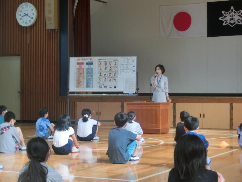 保健指導の様子。保健室の先生から、病気を予防する「新しい学校生活様式」について学年に応じて分かりやすくお話していただきました。全学年に感染症対策の保健指導を行います。