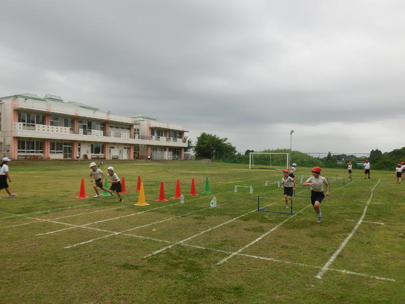 1年生は体育。「反復横跳び」の動きを練習中でした。めざせ、カニカニ忍者!