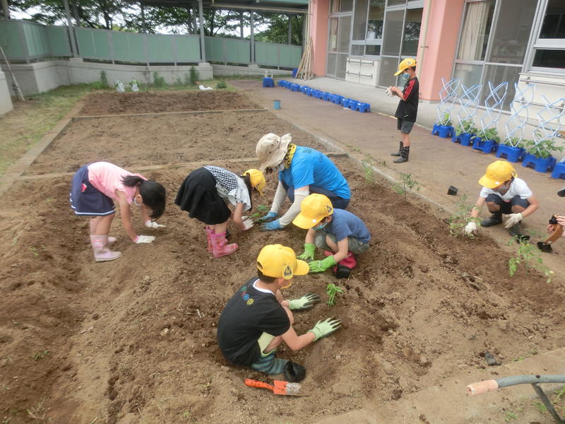1年生の生活科。フルーツトマト、ピーマン、えだまめなどを植えました。昨日の美化作業のおかげで、植えることができました。除草作業、ありがとうございました。