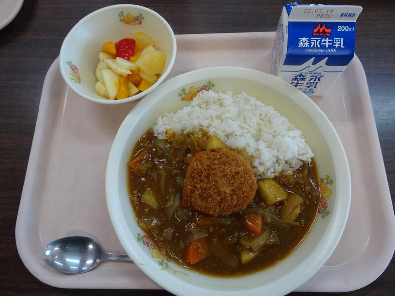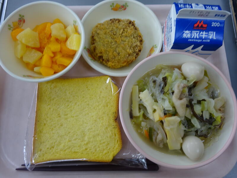 米粉入りかぼちゃパン、牛乳、タイピーエン、馬肉のメンチカツ、柿のフルーツミックス