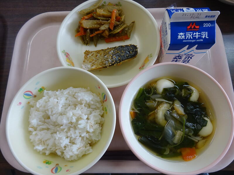 麦ご飯、牛乳、はんぺん汁、さばのごま焼き、きんぴら