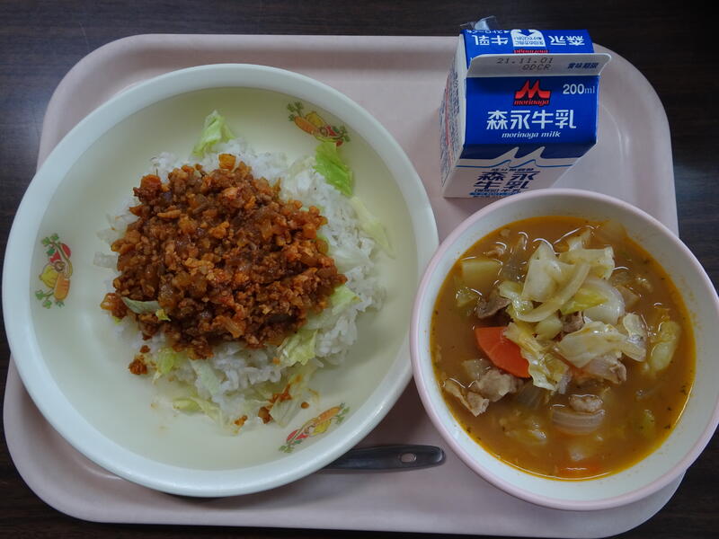 タコライス、牛乳、ブラウンスープ、タコライスの具