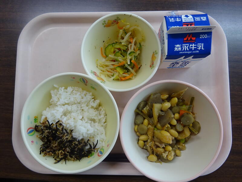 麦ごはん、牛乳、大豆の磯煮、ごま酢あえ、手作りふりかけ