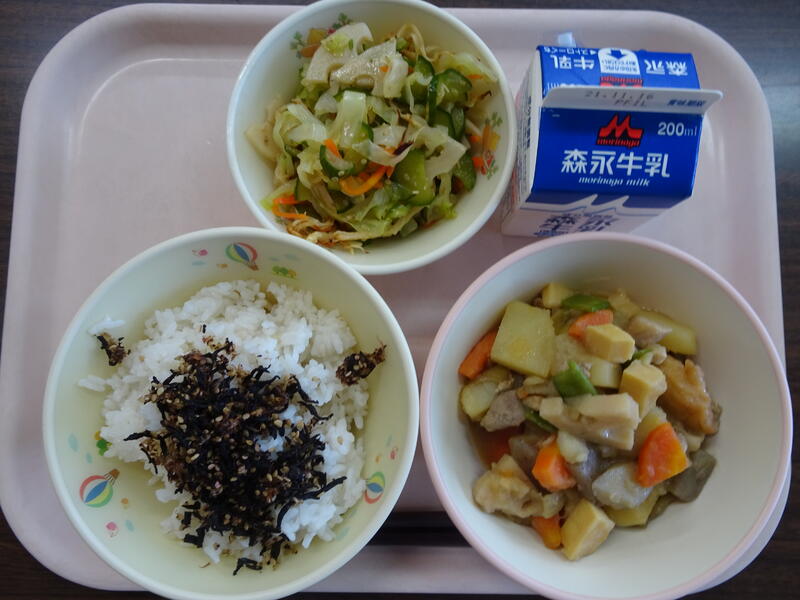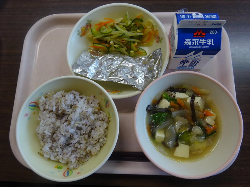 梅じゃこ御飯、牛乳、豆腐とチンゲン菜のスープ、魚の味噌マヨホイル焼き、もやしのカレーサラダ