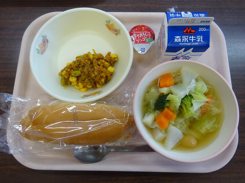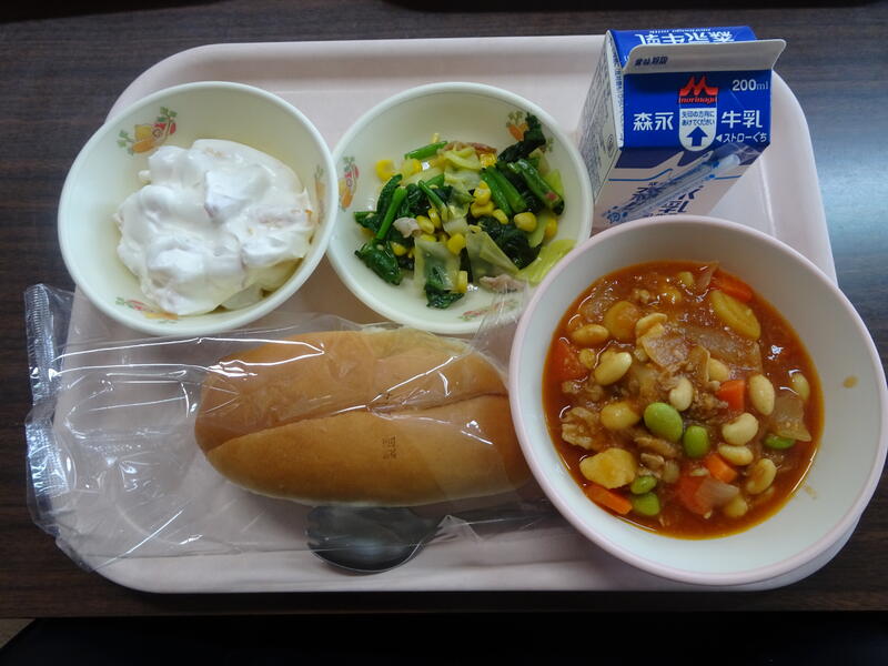コッペパン、牛乳、ポトフ、カレーミートビーンズ、すりおろしりんごゼリー