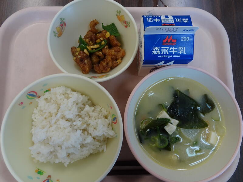 赤飯、牛乳、三色つみれ汁、鶏の唐揚げ、ひじき和え