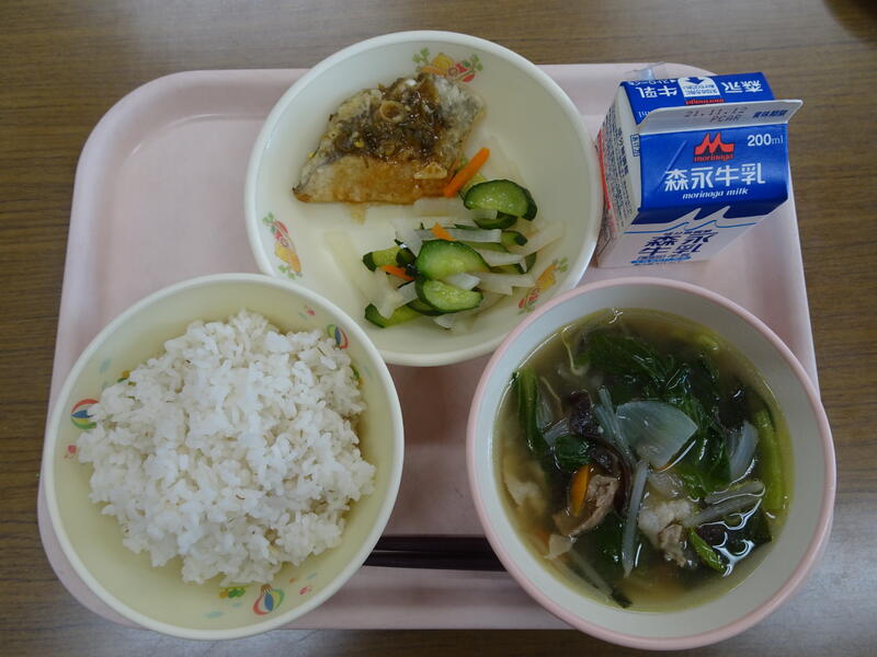 麦ご飯、牛乳、けんちん汁、魚の和風ソース、即席漬