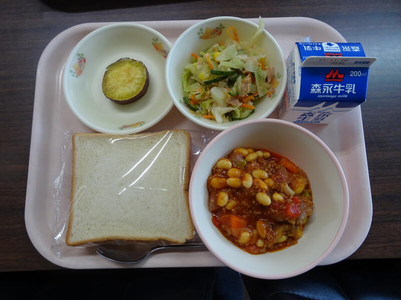 食パン、牛乳、大豆と挽き肉のトマト煮、ツナサラダ、焼き芋ブリュレ