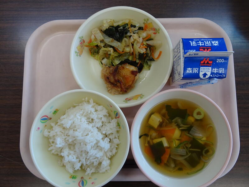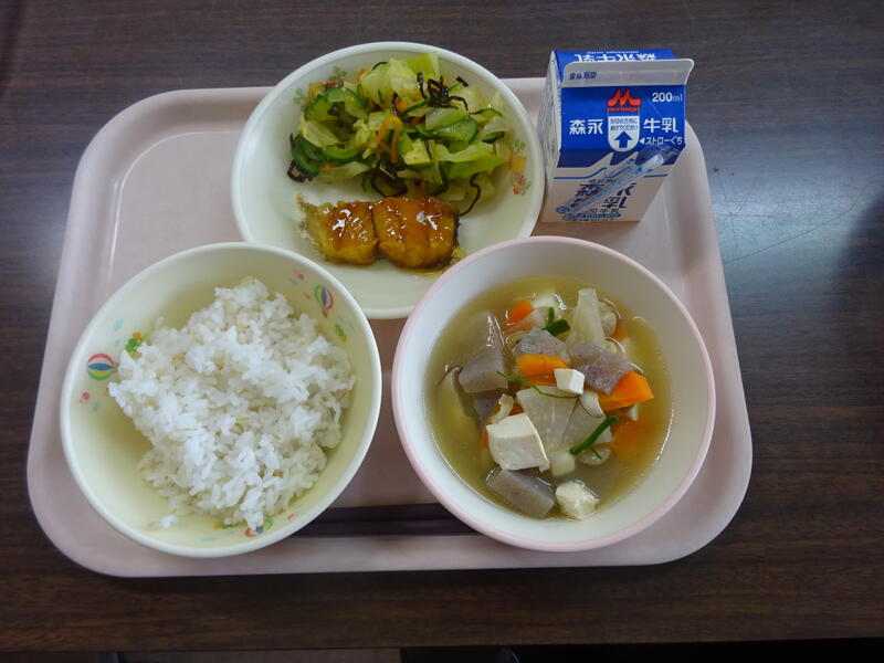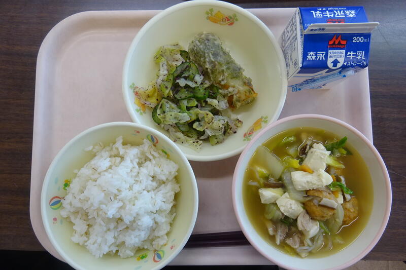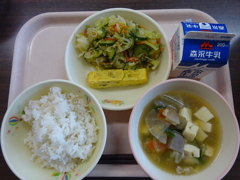 麦御飯、牛乳、ちゃんこ風スープ、ちくわの磯辺揚げ、キャベツのゆかり和え