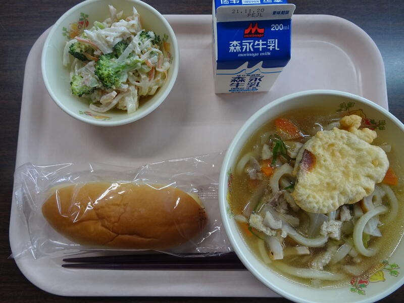 ミルクパン、牛乳、芋天うどん、大根サラダ