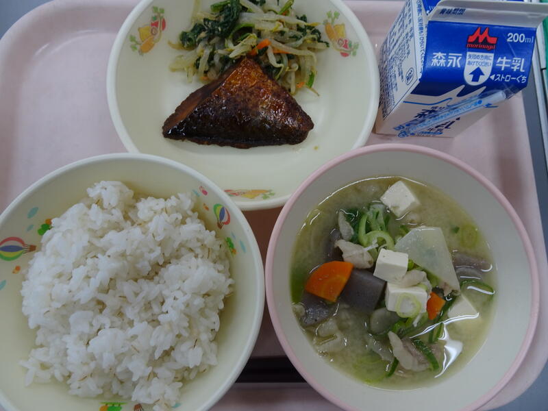 麦ご飯、牛乳、豚汁、さばのソース煮、ほうれん草のごま和え