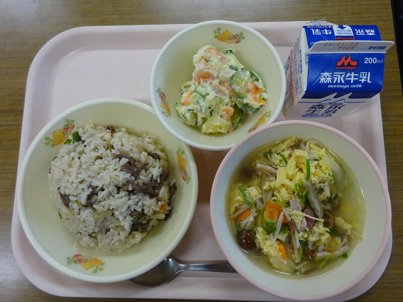 馬肉ピラフ、牛乳、きのこと卵のスープ、ポテトサラダ