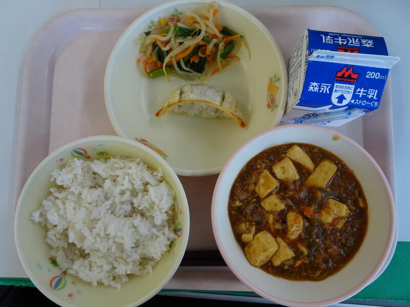 麦ごはん、牛乳、マーボー豆腐、小松菜の中華あえ、焼きぎょうざ