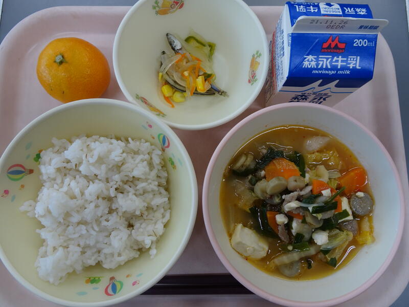 麦ご飯、牛乳、豆腐チゲ、きびなごのマリネ、みかん