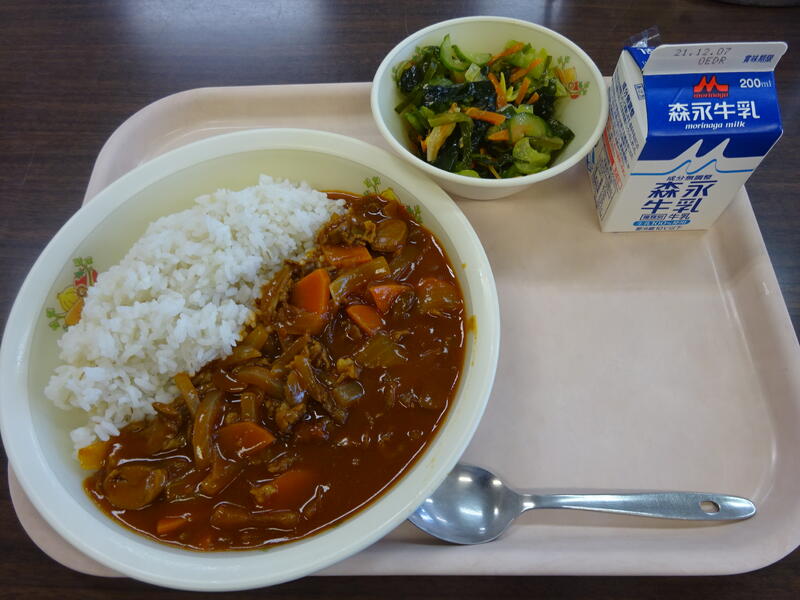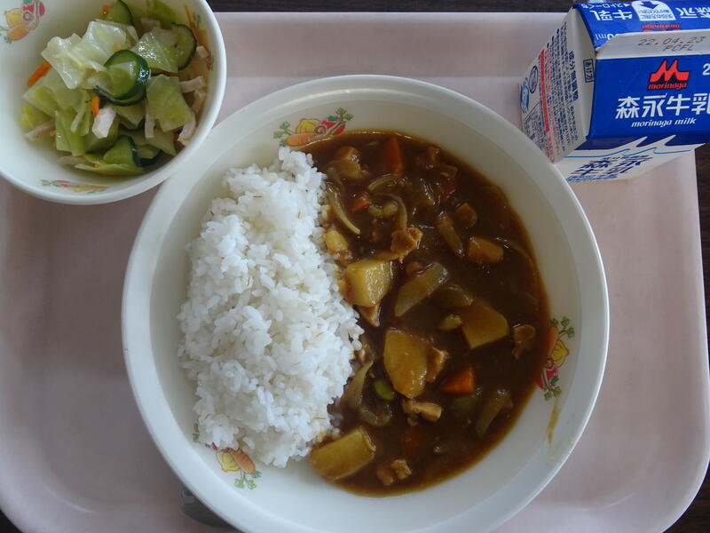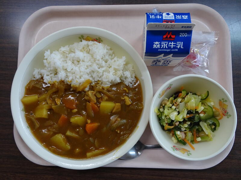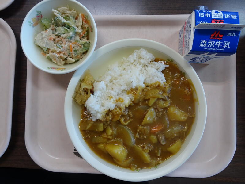 カレーライス、牛乳、蓮根サラダ、福神漬