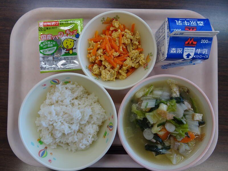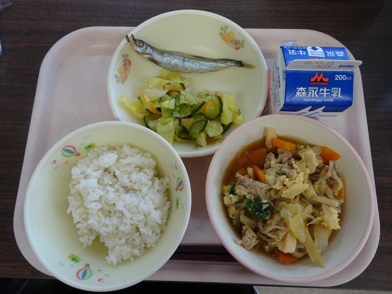 麦ご飯、牛乳、高野豆腐の卵とじ、焼きししゃも、キャベツの甘酢和え