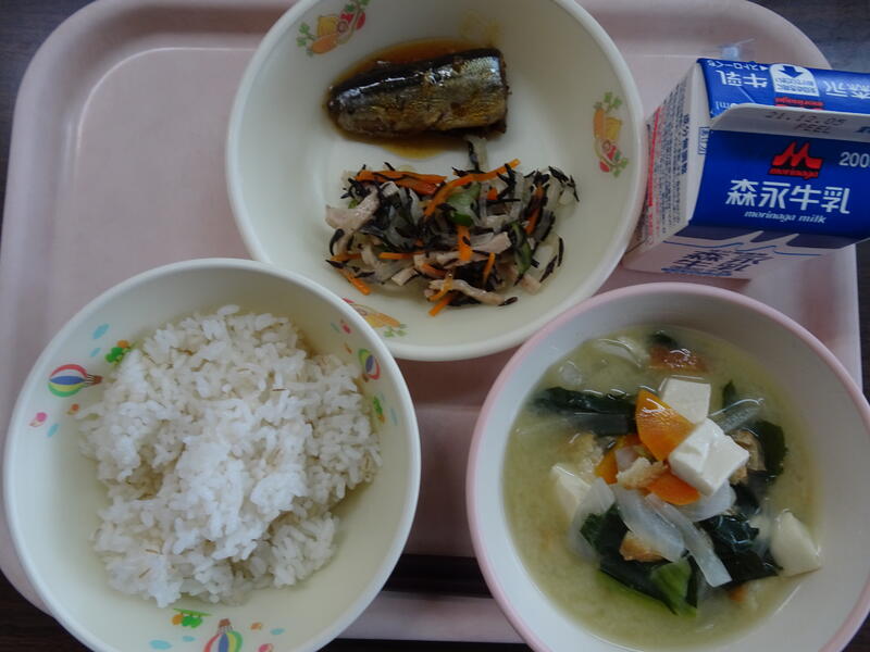 麦御飯、牛乳、みそ汁、さんまの甘露煮、ひじきのサラダ