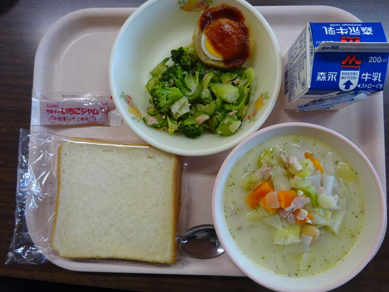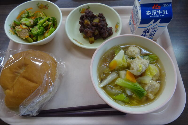 いきなりあんぱん、牛乳、手づくり肉団子のスープ、ブロッコリーサラダ