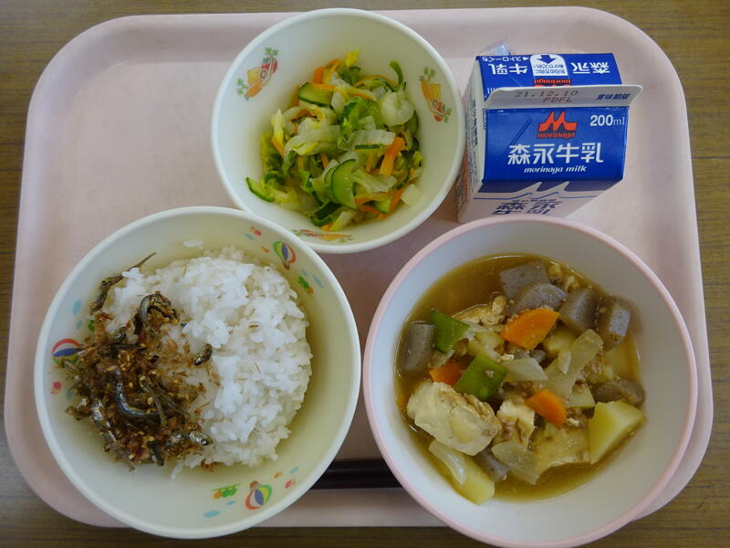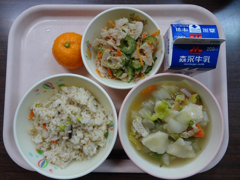 びりんめし、牛乳、白玉粉入りだんご汁、蓮根サラダ、みかん