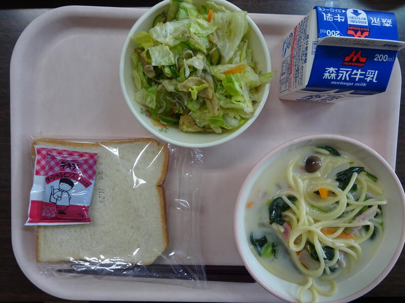 食パン、牛乳、クリームスパゲティ、レタスと揚げごぼうのサラダ、マーシャルビーンズ