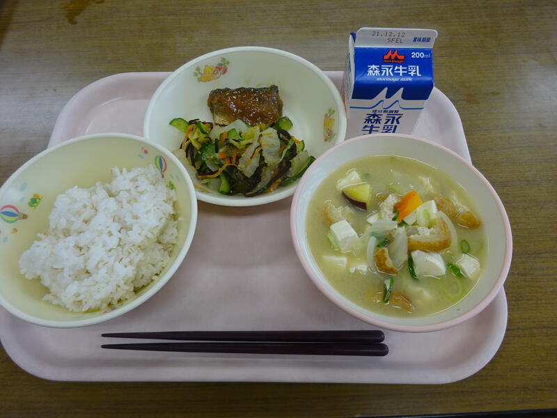 麦ご飯、牛乳、鶏ごぼうスープ、鯖の柚味噌煮、ひじき和え