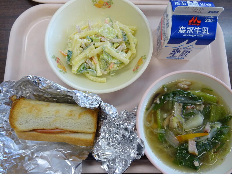 ハムチーズパン、牛乳、春雨スープ、マカロニサラダ