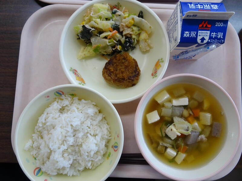 麦ご飯、牛乳、のっぺい汁、ハンバーグのおろしソース、御船川のごまサラダ
