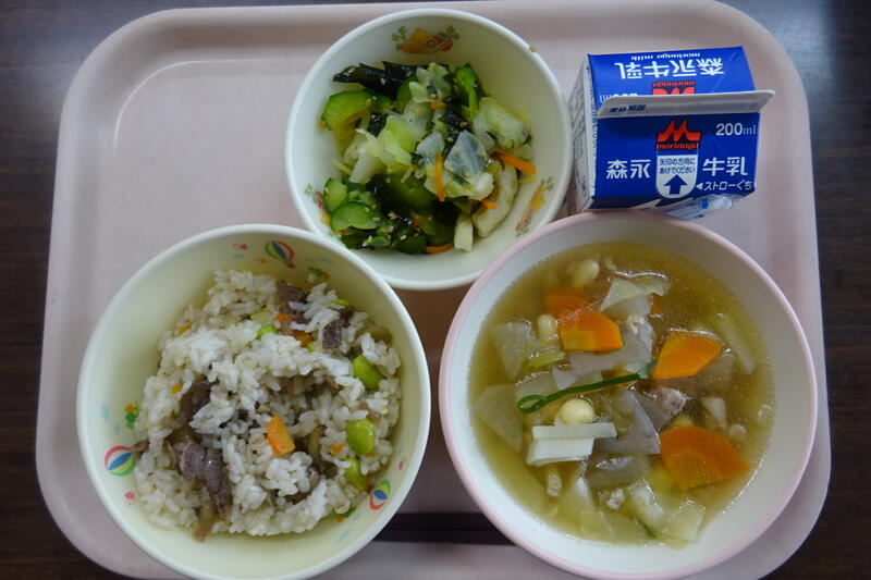 具めし、牛乳、いちょう葉汁、わかめといかの酢の物