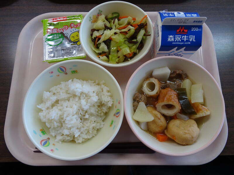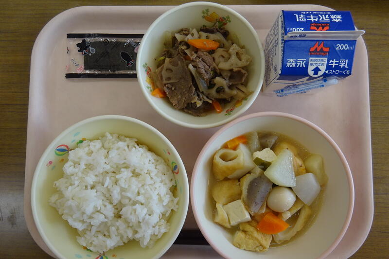 麦ご飯、牛乳、味噌煮込みおでん、牛肉と蓮根の炒め煮、味付けのり