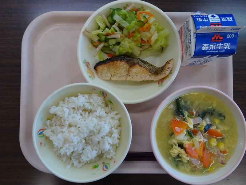 麦ごはん、牛乳、ほうれん草と卵のスープ、鮭のムニエル、フレンチサラダ