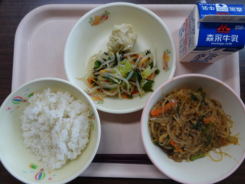 麦ご飯、牛乳、汁ビーフン、春巻き、キムチ和え