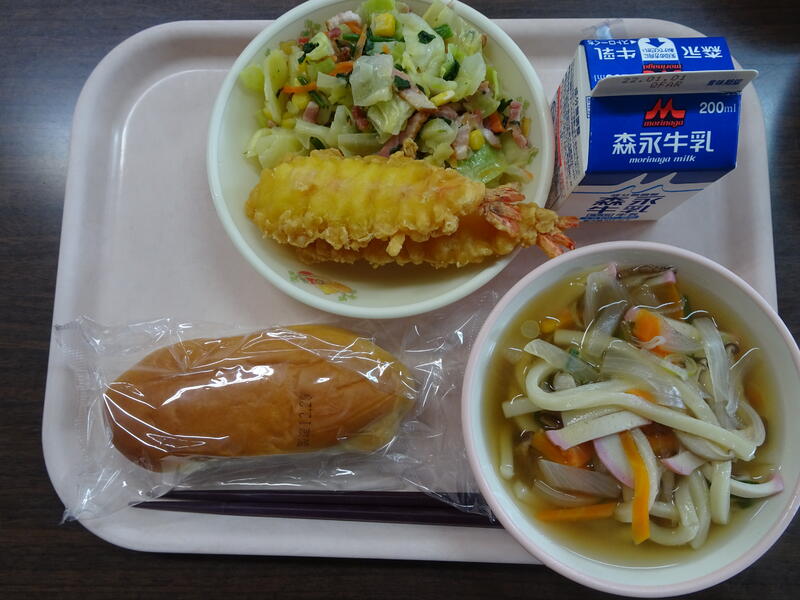 ミルクパン、牛乳、えび天うどん、ほうれん草サラダ