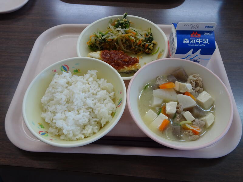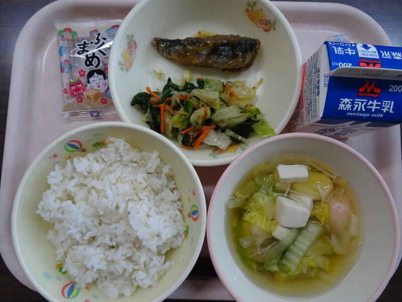 麦ご飯、牛乳、つみれ汁、いわしのみぞれ煮、ほうれん草のおかか和え、節分豆