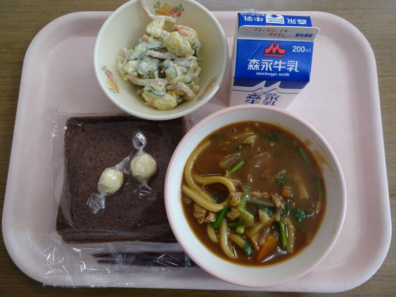 ココアパン、牛乳、カレーうどん、からいもマッシュサラダ、チーズ