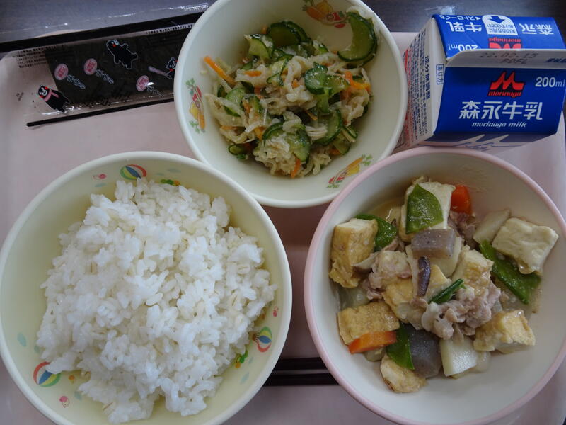 麦ご飯、牛乳、厚揚げの味噌煮、切干大根の酢の物、味付けのり